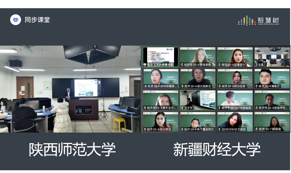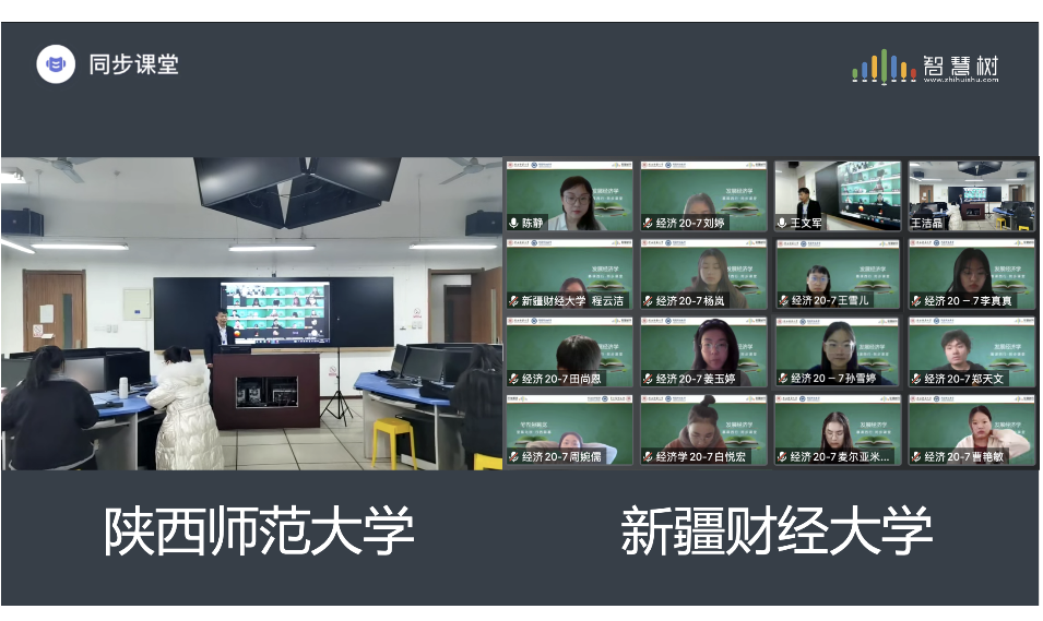 启动仪式后,王文军副教授开展了“发展经济学”同步课堂教学。王老师围绕发展要素,主讲了“人口要素、资源要素与环境要素”三个专题。“性别比失衡与天价彩礼”、“巧妇难为无米之炊”、“绿水青山就是金山银山”等现实问题及理论为引子,王老师深入浅出地对三个要素在影响发展方面进行了详尽地讲解。新疆财经大学的同学门积极参与课堂,师生开展了有效的线上互动,教学效果明显。同学们对别开生面的线上实时同步课堂表示欢迎,为可以现场体验名师教学并参与互动感到欣喜,同学们表示这样的“同步课堂”优质、高效、充满新技术、新时代感,渴望更多的交流与互动!