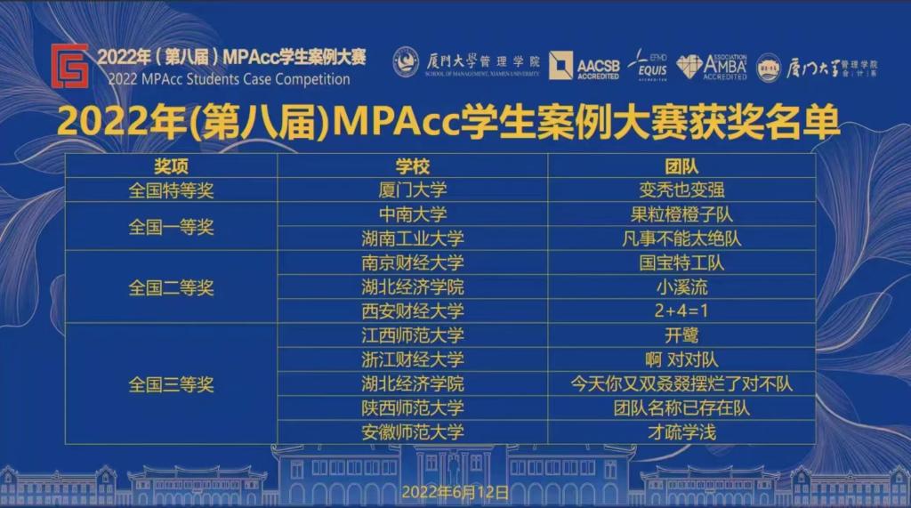 本届案例大赛历时近四个月,分初赛第一阶段及第二阶段,设置了七个赛区,邀请到了全国MPAcc培养单位的MPAcc学员、员工及本科生自由组队参赛。今年公司共有13支队伍参加了本届大赛西北赛区的选拔。初赛第一阶段,“团队名称已存在队”和“风险偏好组”2支队伍成功晋级全国百强。初赛第二阶段,公司“风险偏好组”队成功获得西北赛区二等奖,“团队名称已存在队”则成功晋级全国十强”,并在6月11日至12日的复赛和决赛中脱颖而出,荣获全国三等奖。