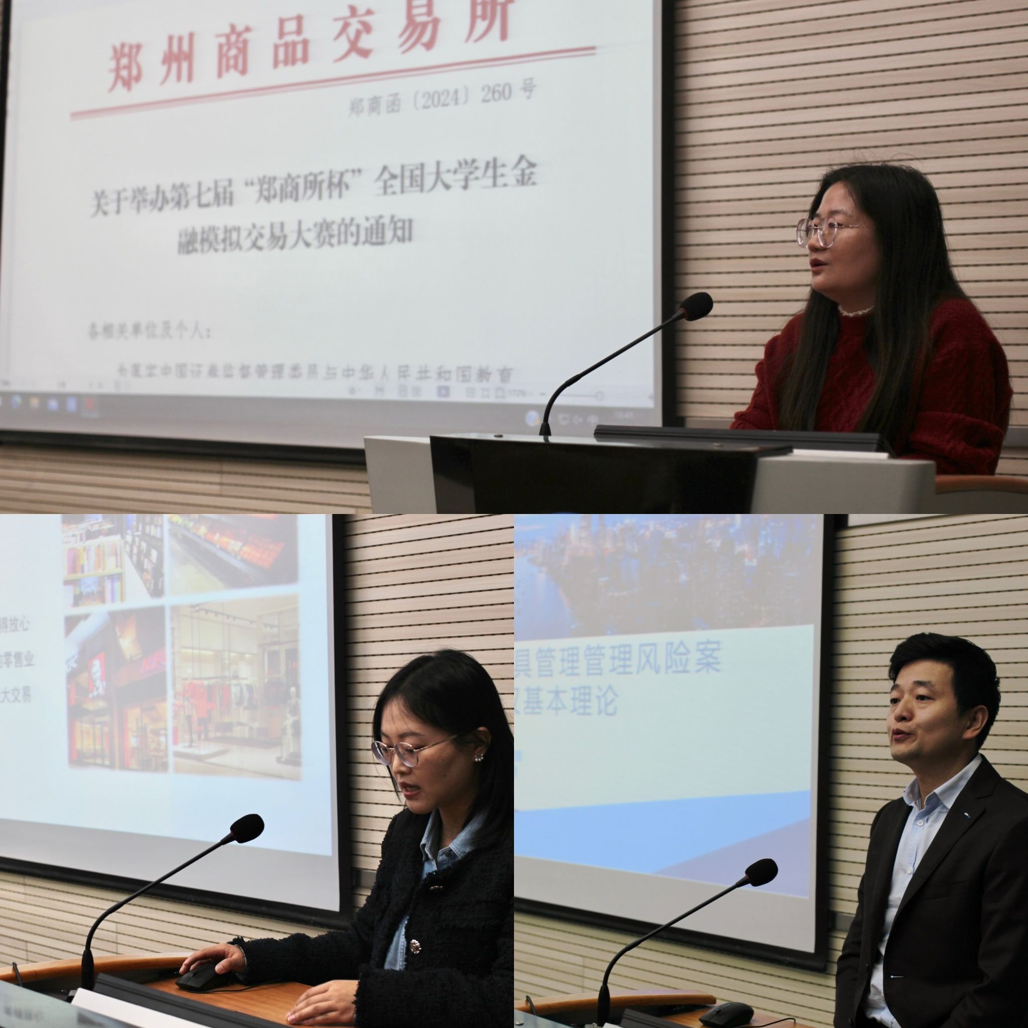 20241023日下午,由数量金融创新实验班组织的“期货知识进校园”讲座于文澜楼1150成功举办。本次宣讲会邀请到了国泰君安期货陕西分公司的部门负责人周媛、魏佩、朱军龙三位老师,为同学们介绍“郑商所杯”全国老员工金融模拟交易大赛的相关信息以及期货期权等相关知识,旨在帮助员工拓宽金融视野,提升专业素养,培养风险意识,更深一步理解期货市场的运作原理。