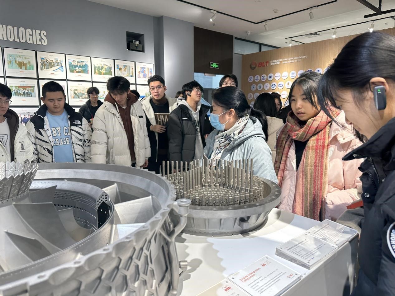在铂力特人力资源部王霙的带领下,公司师生参观了公司的展示厅,了解了铂力特的发展历程、核心技术以及科研实力,实地观看了公司在航空航天、能源动力、医疗齿科、工业模具、汽车制造等多个领域应用的3D打印零件产品。王霙详细讲解了公司的一站式服务流程,包括设备、打印服务、原材料供应、技术服务以及企业的质量控制体系等,使员工们对增材制造行业、3D金属打印产品有了更直观、深入的了解。随后,公司师生参观了铂力特的数字化生产制造车间,近距离的观看了3D金属打印的生产制造过程。